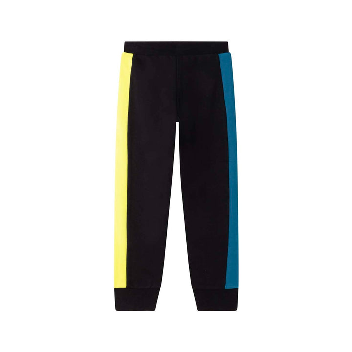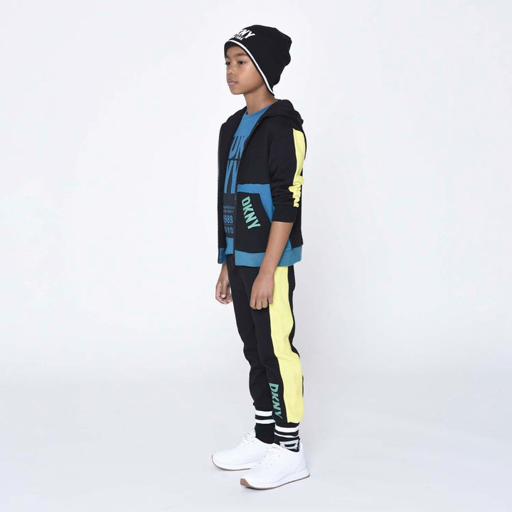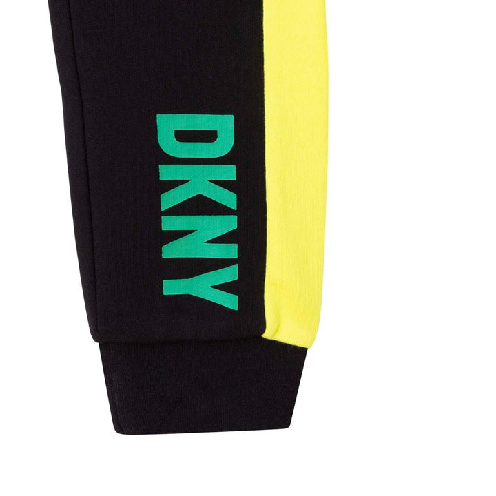 Boys black joggers designed by American brand DKNY. These cuffed joggers have lime yellow and teal blue colourblock panels and concealed side pockets. Great for all-day comfort, they are made in soft cotton sweatshirt jersey with an elasticated, drawstring waist. The label's iconic green logo print can be found on one leg.