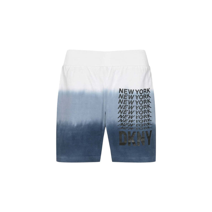 White and blue dip dye shorts for boys and girls by DKNY, made in soft mid-weight cotton jersey. Great for casual wear, these shorts have a white box logo print on the front, with black repeat lettering on the back. They are finished with a comfortable, elasticated waistband and useful pockets on the hips.