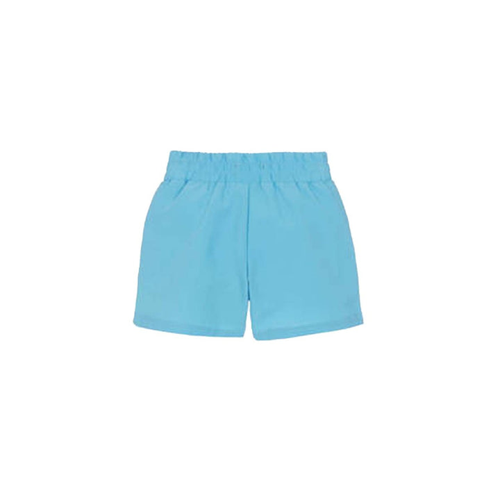 Blue swim shorts for teen boys by American brand DKNY, with contrasting blue and yellow panels. Silky and lightweight, they have a white logo print on the front, with an elasticated waistband, jetted pockets and a mesh lining for comfort.