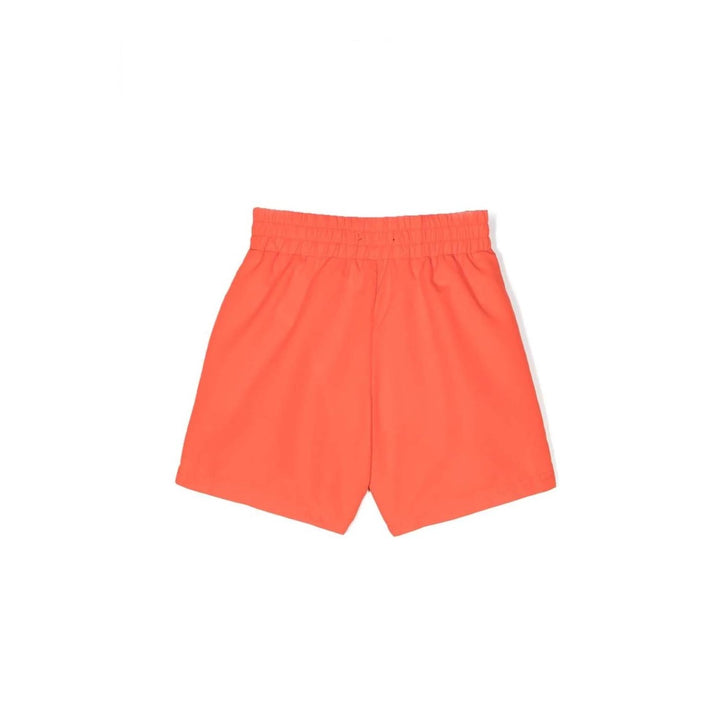 Orange swim shorts for boys by American brand DKNY, with contrasting red and blue panels. Silky and lightweight, they have a white logo print on the front, with an elasticated waistband, jetted pockets and a mesh lining for comfort.