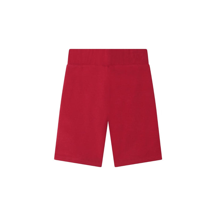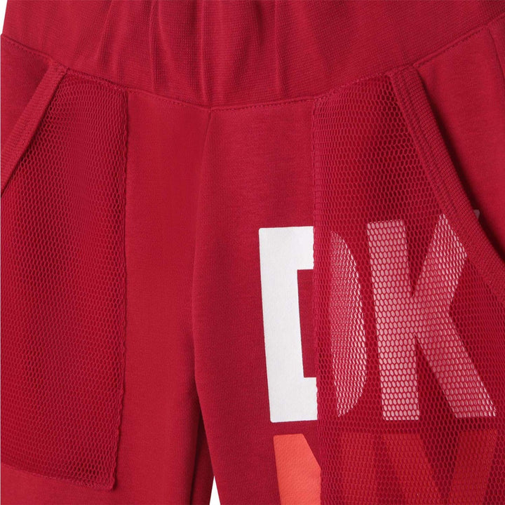 Sporty bright red cotton shorts for boys by American brand DKNY. Made in comfortable sweatshirt jersey with an elasticated waistband, they have cool mesh front pockets with a blue and white logo layered beneath, for designer style.