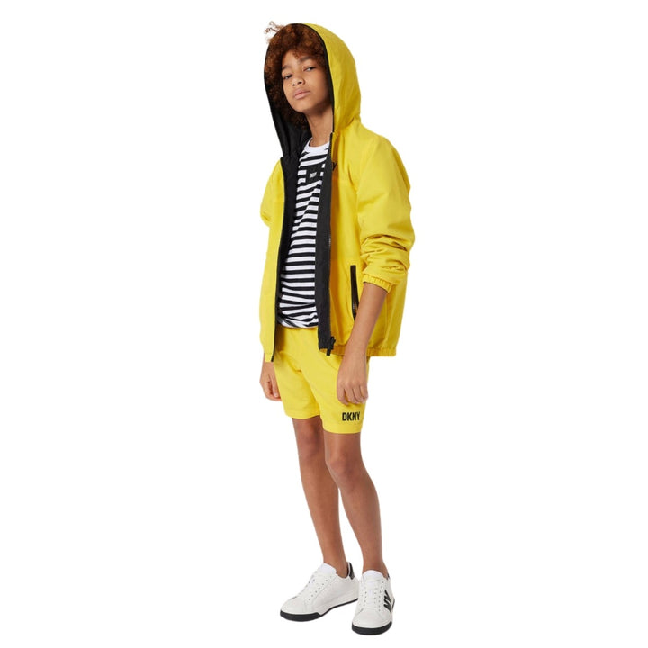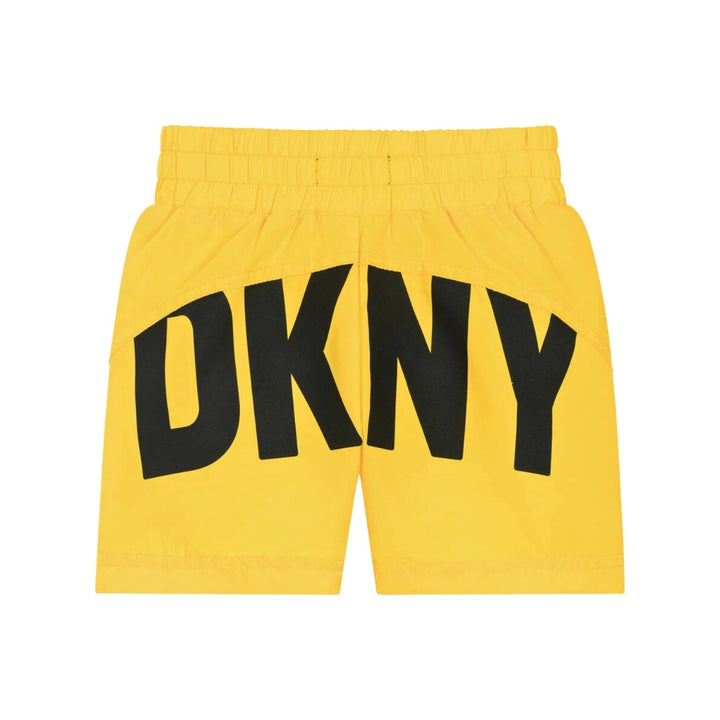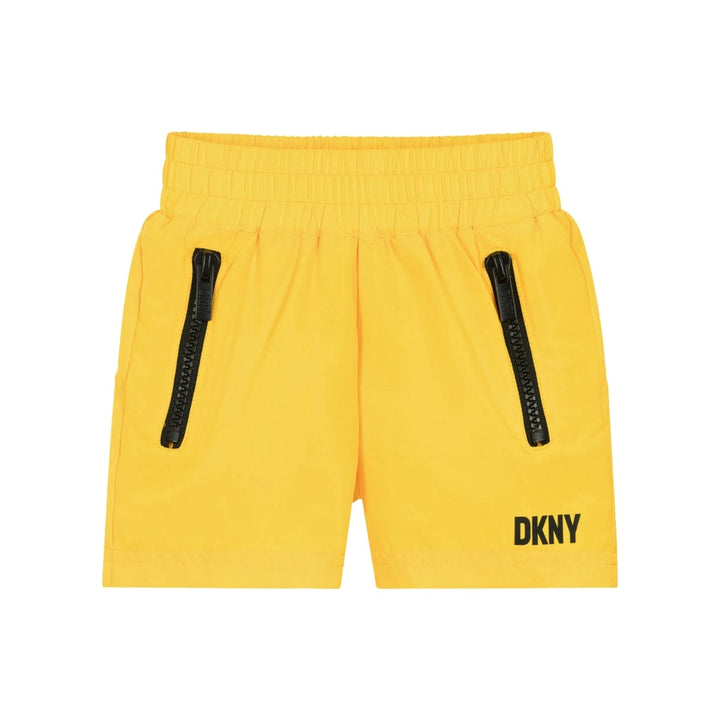 Bright yellow swim shorts for boys by DKNY, made in a soft and smooth quick-drying fabric, with a lightweight mesh lining. For a distinctive designer look, there is a bold black logo printed on the back, with a further smaller logo on the front. They have an elasticated waistband for a comfortable fit and useful front pockets with chunky black zip fastenings.