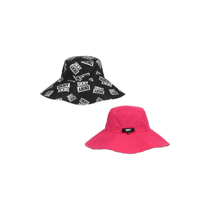 Great for summer days, this reversible sun hat for girls is by DKNY. The bright fuchsia pink side has a rubberised black and white logo patch, whilst the black side is patterned in a matching logo print. Woven in soft smooth fabric, the hat has a wide floppy brim to help shield eyes from the sun.