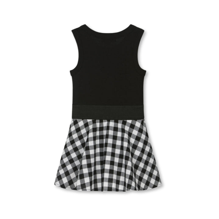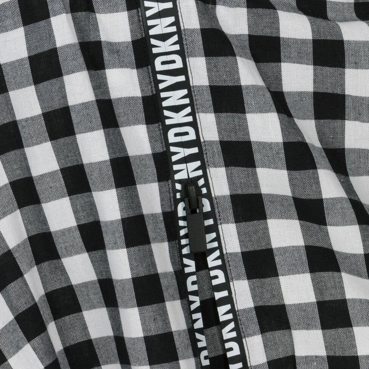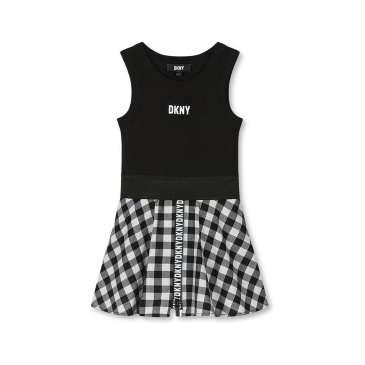 A sleeveless black and white dress for girls by American brand DKNY, that gives a designer touch to casual days. The bodice is made in soft, comfortable cotton jersey, with a bold white logo printed on the front. The wide, stretchy, elasticated waistband has a flared cotton gingham skirt below, with a central zip fastening patterned with repeat white logos. If the zip is opened, the dress can be worn as a tunic.