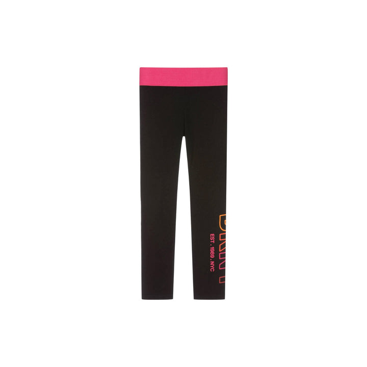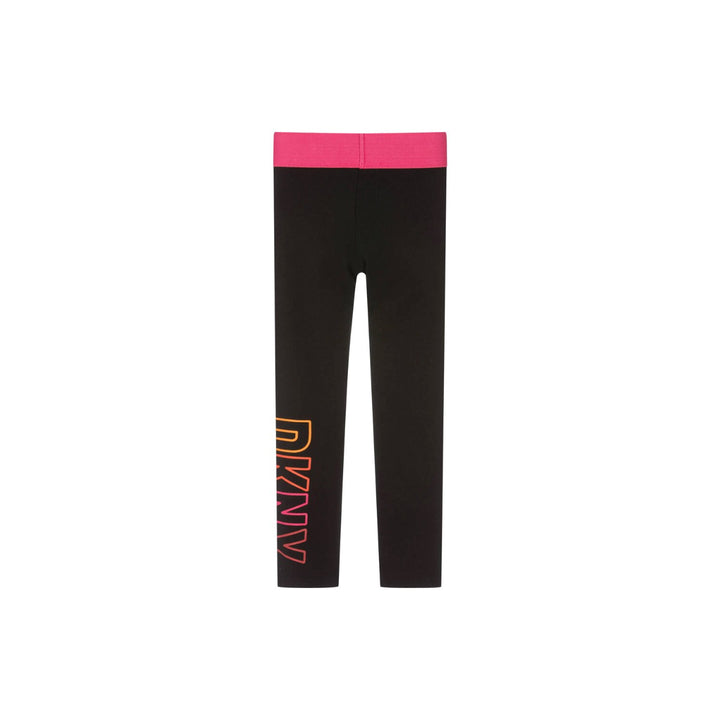 Girls black leggings from DKNY, made in soft organic cotton jersey. They have a bright pink elasticated waistband for a pop of colour and comfort. One leg is printed with pink and orange logo for a designer finish.