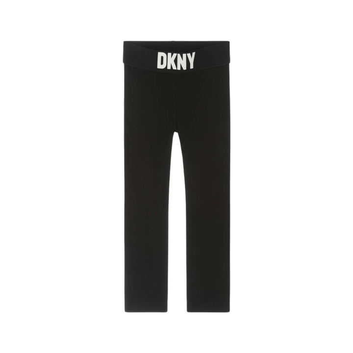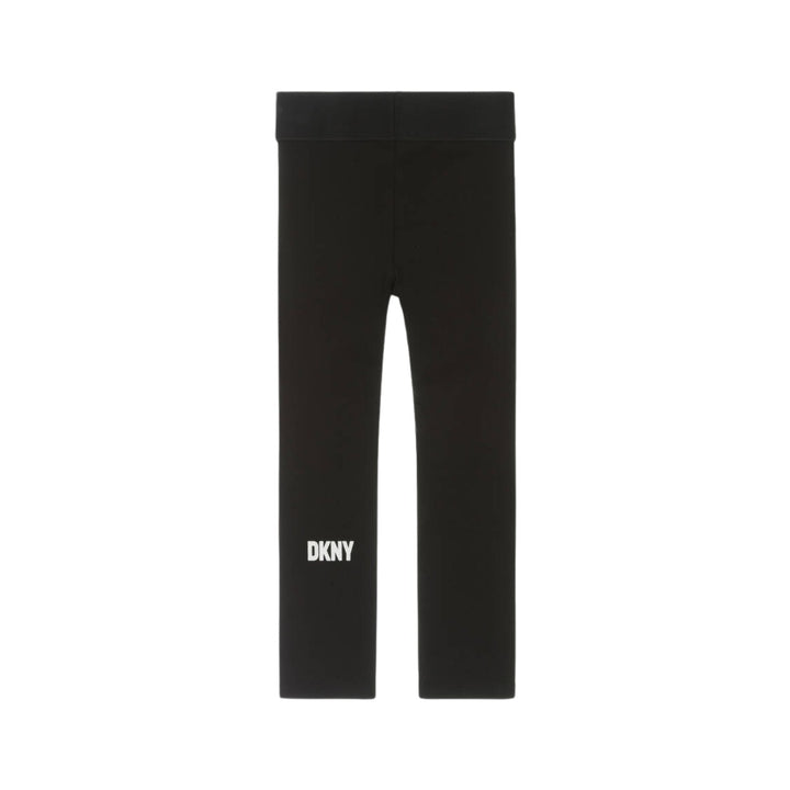Black full-length leggings for girls by American brand, DKNY. Comfortable for everyday casual pairing, they are made in soft and stretchy organic cotton jersey. For a contemporary look, an eye-catching white logo is printed on the front of the wide elasticated waistband and the back of one leg.