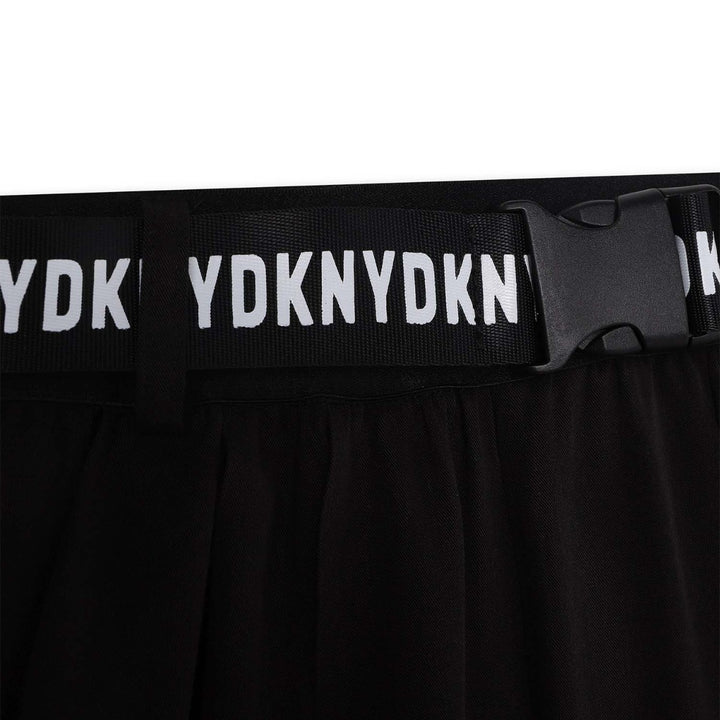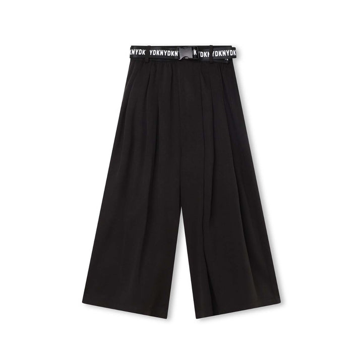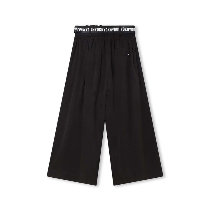 Designed by DKNY, these cropped black trousers for girls have a cool, wide-leg fit. Pleated on the front and gathered around the back for a flattering look and a good fit, they are made in soft, lightweight viscose twill. The comfortable, elasticated waistband has an adjustable, black and white webbed belt with a clip buckle fastening for a touch of edgy, utility style. The designer's logo patch can be found on the faux back pocket.
