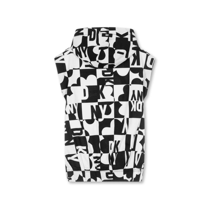 Girls black and white hooded dress by DKNY, made in soft cotton jersey. A rich contrast, the check pattern incorporates logo lettering for instant recognition. This casual dress has seamless short sleeves, a lined hood and an elasticated hem. A rubberised logo tab can be seen on the top of the hood for a final designer touch.
