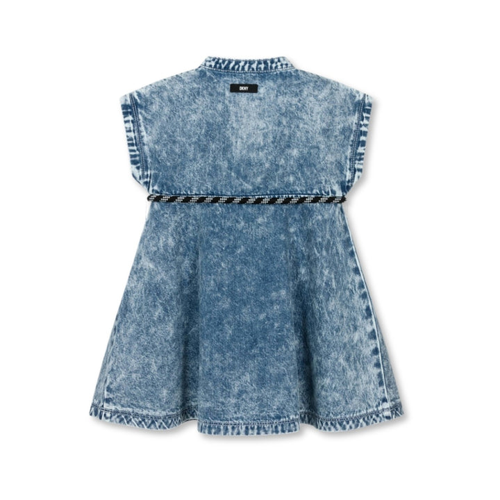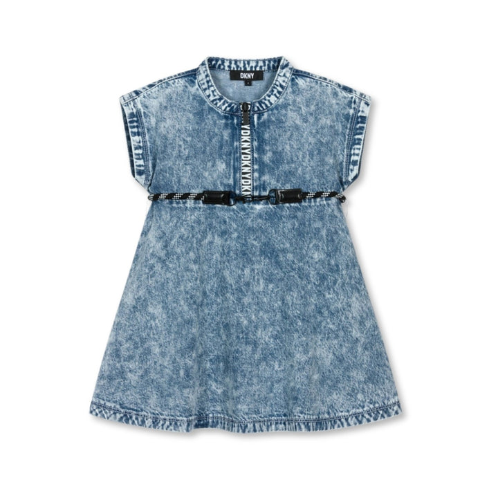 Stylish blue dress for girls by DKNY, made in soft, non-stretch denim with a cool acid wash effect. The sleeveless bodice has a boxy shape and a monochrome logo zip fastening on the chest. There is an edgy carabiner-style belt around the waist, shaping a feminine silhouette with an urban twist. A black and white rubberised logo badge on the back of the neck completes the look with branding.