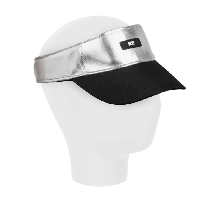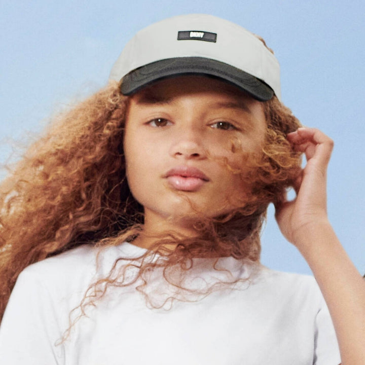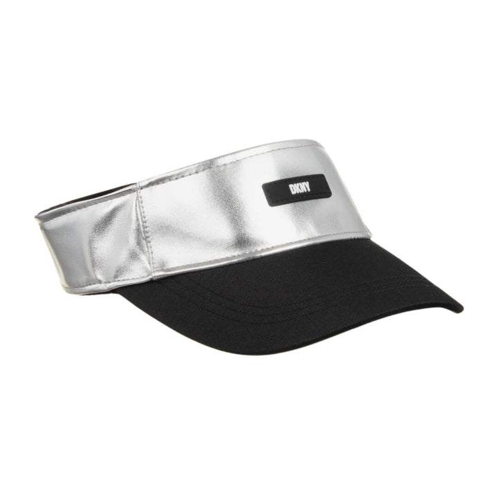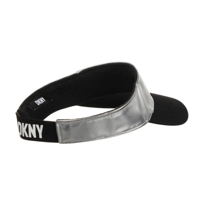 Metallic silver sun visor for girls by DKNY, stamped with the brand's iconic logo on the front in a monochrome colourway. Lined in soft towelling for comfortable wear, this edgy accessory is made using soft faux leather for a streetwear-inspired vibe. On the back, there is an elasticated logo strap for a secure, stretchy fit.