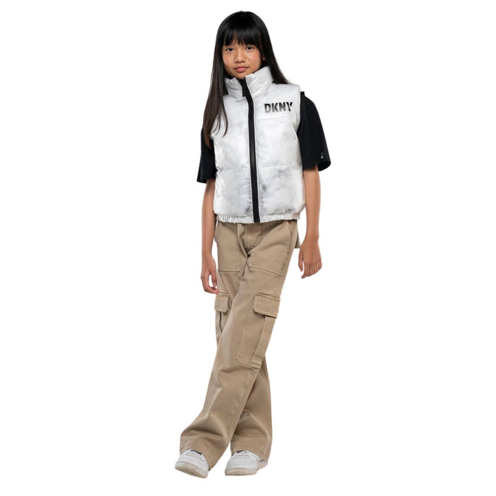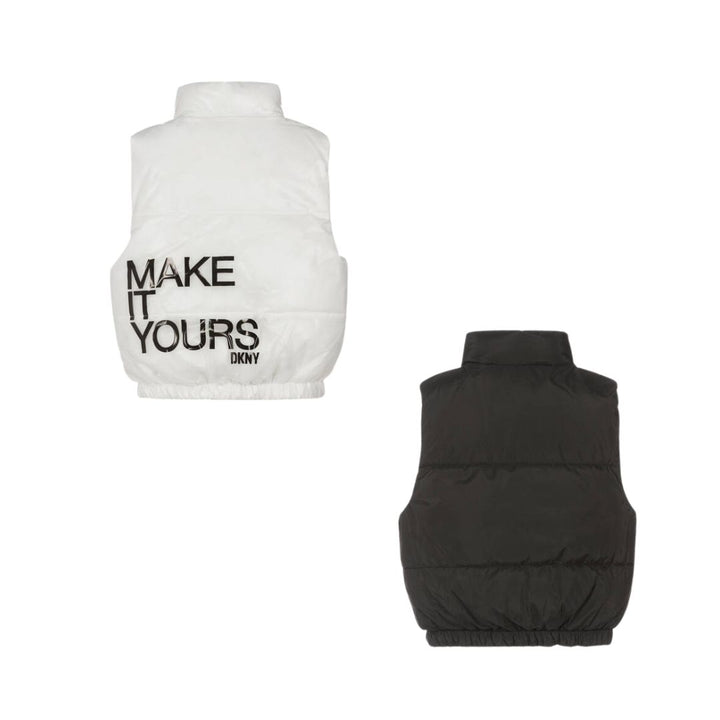 A stylish reversible puffer gilet for girls by DKNY. The white side is transparent, exposing the soft warm padding. It has a black logo print on the chest and a 'Make it Yours' slogan on the back. The black side has a white logo badge on the chest and useful front pockets. This cool sleeveless jacket fastens with a chunky exposed zip on the front and has an elasticated waist for a snug fit.