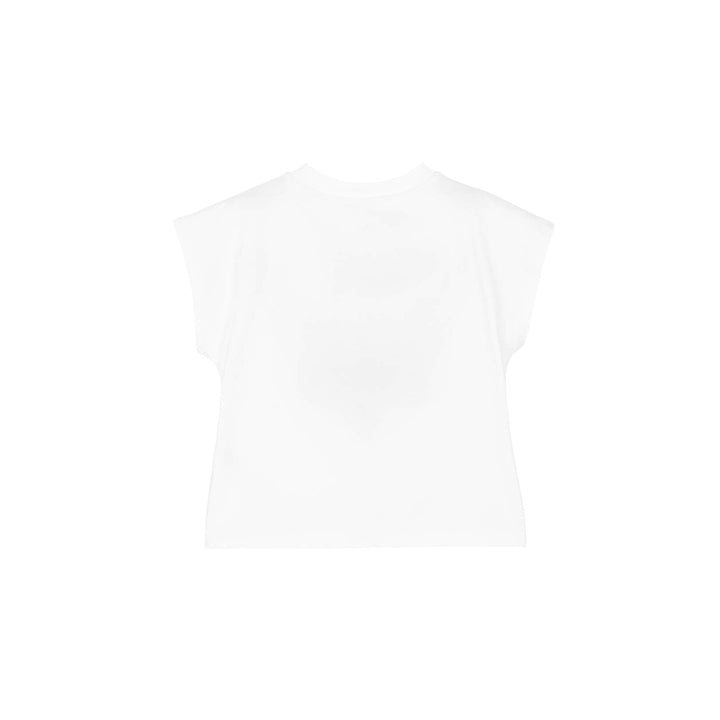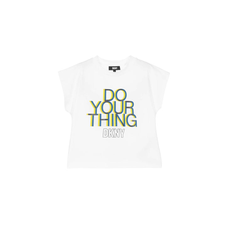 White T-shirt for girls by DKNY, made in soft and comfortable organic cotton jersey. In a fun boxy style, it features a bold blue and green slogan print on the front.