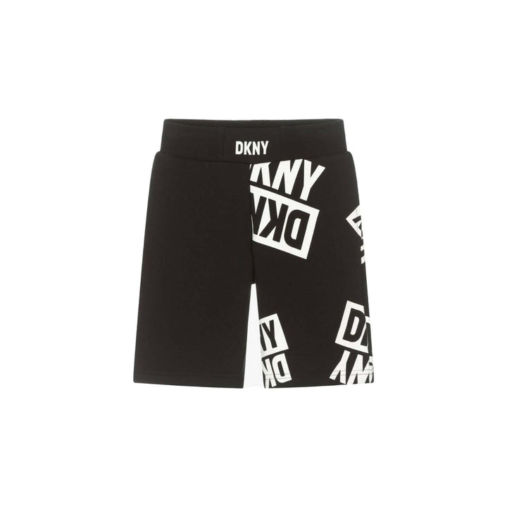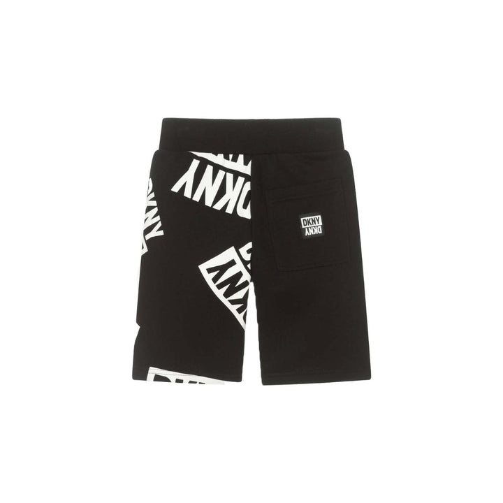 Boys and girls black cotton jersey shorts by DKNY, with on-trend box logo prints on one legs. Soft and comfortable, these easy-wearing bottoms have an elasticated waist and side pockets.