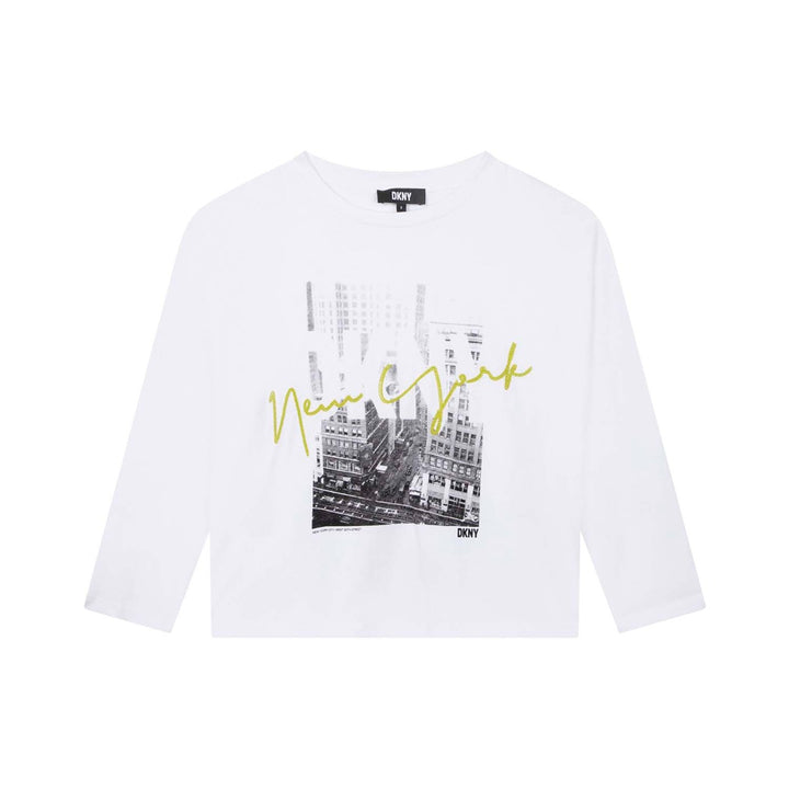 When you desire to dress your girl in a classic white t-shirt, we have this excellent option for you to choose from. It’s a white full sleeves T-Shirt with New York city landscape print on it with New York text printed over the city landscape graphic. The use of breathable cotton fabric and round neck are adding more to the comfort factor of the t-shirt. Shop for it right here!