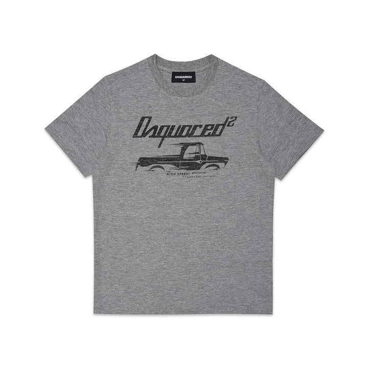 This classic printed t-shirt in grey color by DSQUARED2 is a definite buy. The brand logo print with the utility truck print is giving this truck a classy look. For utmost comfort, this t-shirt is designed with short sleeves and with the use of breathable cotton fabric. It can be paired with a skirt, denim pants, shorts, capris, trousers, or any other preferred bottom wear. So, place your order in a suitable size.