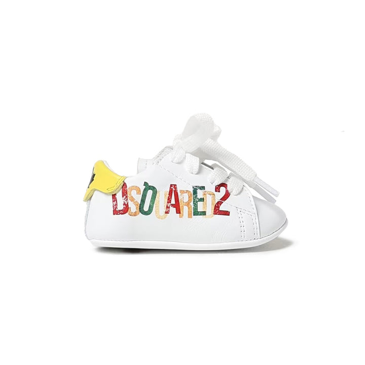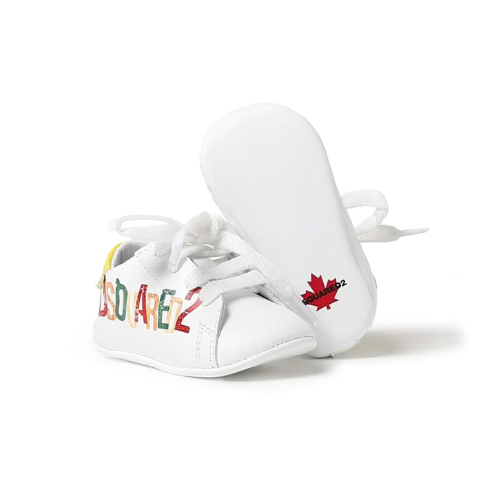 These sweet pre-walker trainers form Dsquared2 are perfect for your baby boy. In a crisp white shade the shoes have smooth soles with the logo in multi color. The shoes fasten with laces which feature the brand logo spread across both shoes in contrasting black script.