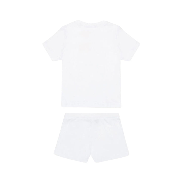 Dsquared2 Kids’ Short set is crafted from white cotton jersey. It comprises a T-shirt and coordinating shorts adorned with a graphic multicolour logo print.