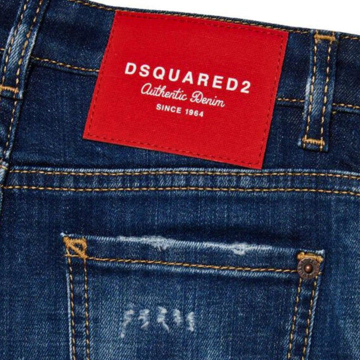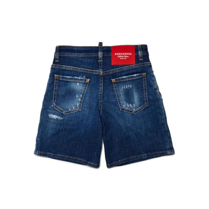 Mid-blue denim short pants distinguished by color contrasting gradients, whiskers, abrasions and mending breaks. Dsquared2 label applied to the flap (flag logo).