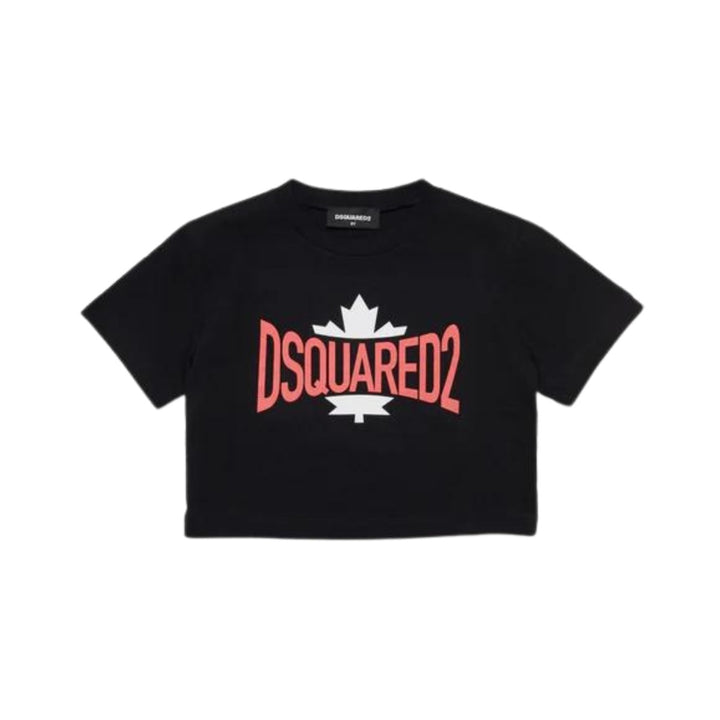 Cropped crew-neck T-shirt in short-sleeved jersey. Featuring a Dsquared2 logo with contrasting color leaf graphic on the front. Made of 100% cotton. An ideal garment for extremely feminine casual looks.