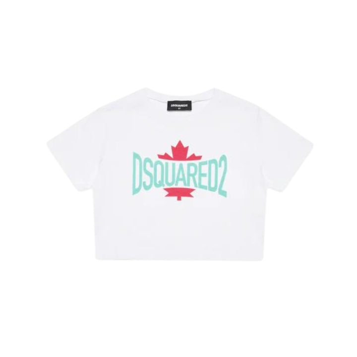 Cropped crew-neck T-shirt in short-sleeved jersey. Featuring a Dsquared2 logo with contrasting color leaf graphic on the front. Made of 100% cotton. An ideal garment for extremely feminine casual looks.