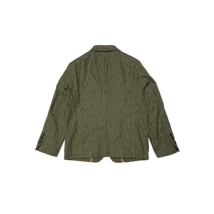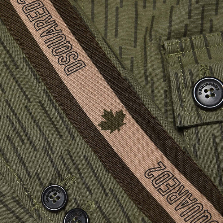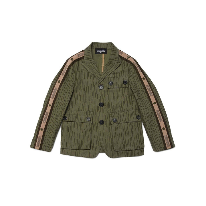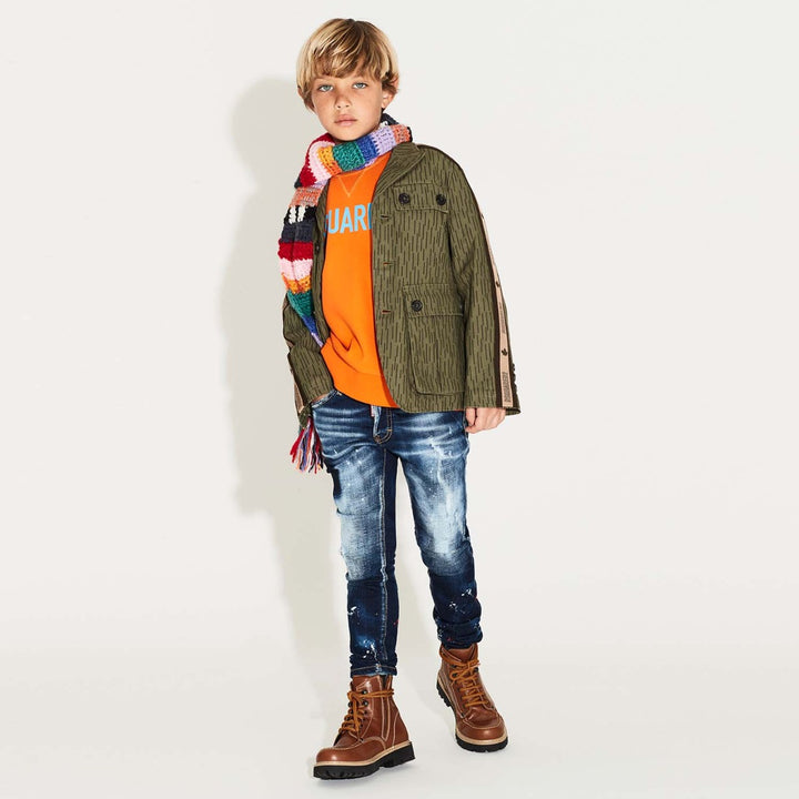 Olive green boys coat by dsquared2 with a nice patterened sleeve and logo name written on side. A cute detailing in the front with pockets and buttons.