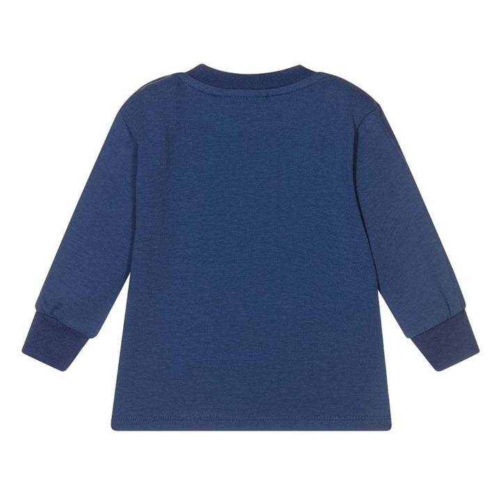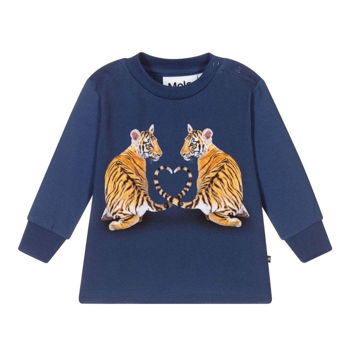 Blue top for little boys by Molo, made in soft organic cotton jersey. The front has a gorgeous print of two tiger cubs in orange and black. There are useful popper fastenings on one shoulder.