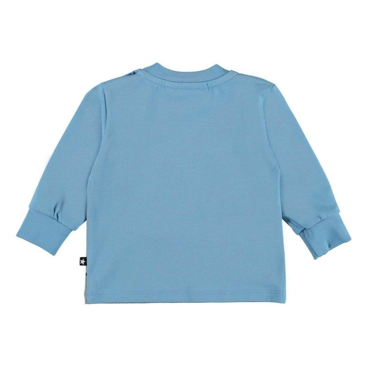 Eloy is a light blue baby top with a sweet print of puppies and a cockatoo, skating together. Eloy has an easy snap closure on one shoulder. This Molo product is GOTS certified organic, which means that it is made with certified organic materials and
