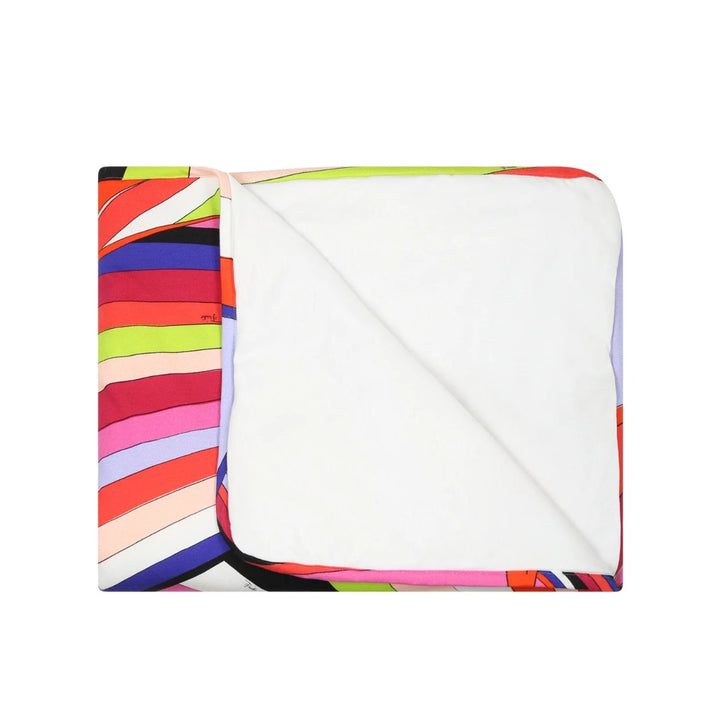 Multi-coloured baby blanket for baby girls by luxury Italian designer Emilio Pucci. Made from lightly padded soft cotton, it features the brands iconic Iride print pattern in pink, red, purple and green. Comes with dust bag. Matching items available for purchase separately.