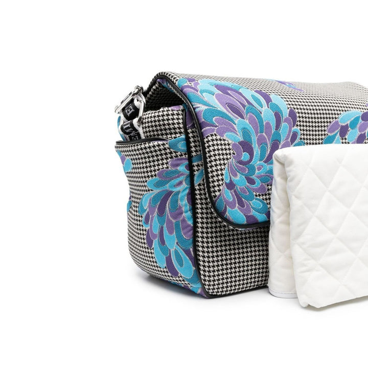 Luxury baby changing bag by Emilio Pucci, . The fabric is decorated with the designer's striking Lilly design in shades of blue, Black and Grey, with a silver engraved logo badge on the magnetic front flap. The adjustable strap is woven with the Italian label's logo in black and white. Lined with soft cotton twill, there are elasticated inner pouch pockets, a spacious interior and convenient outer pockets on the sides. A quilted viscose changing mat is included.
