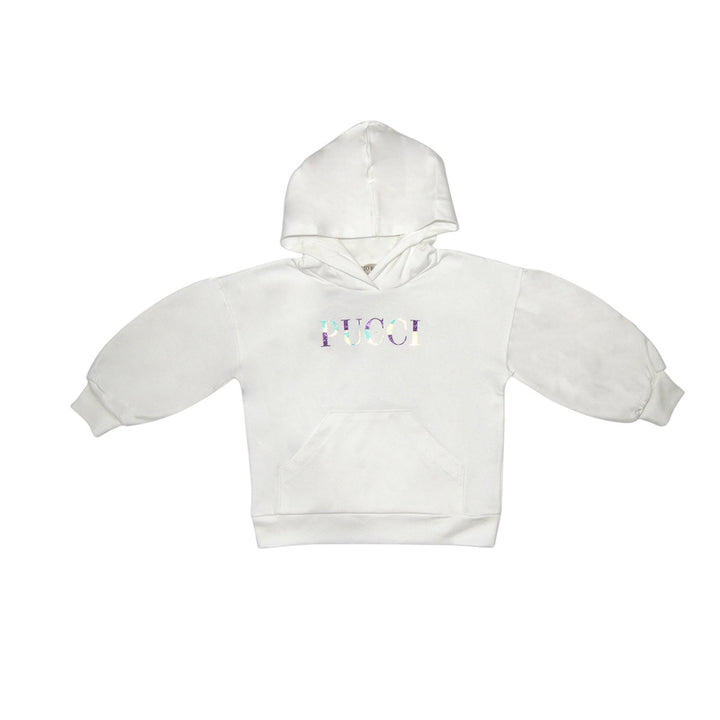 White Hooded sweatshirt by Emilio Pucci with full sleeve 100% cotton perfect for monsson and winters with a colorful logo in the centre and two sided pockets. It will be great fit for your Kids casual days and movies.