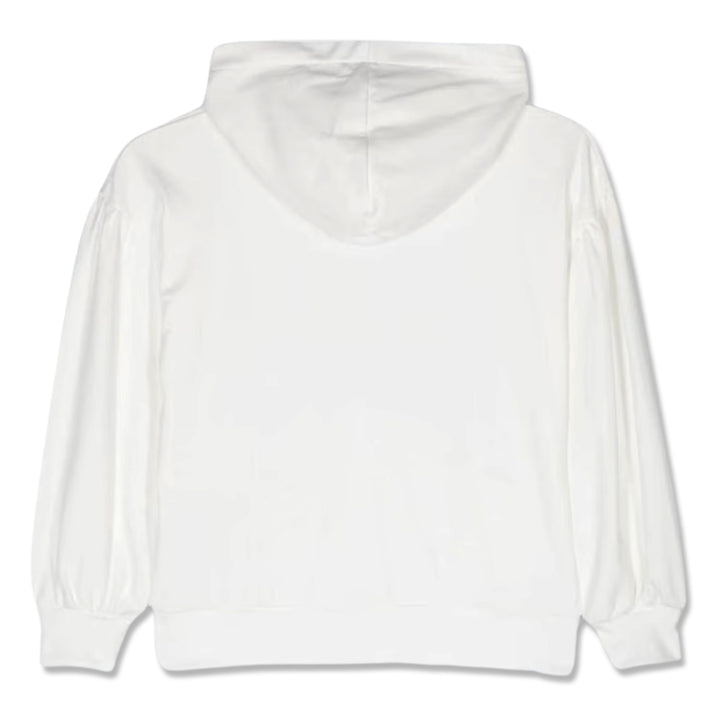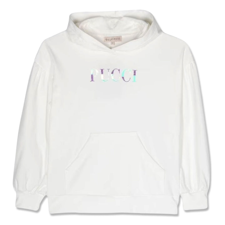 White Hooded sweatshirt by Emilio Pucci with full sleeve 1% cotton perfect for monsson and winters with a colorful logo in the centre and two sided pockets. It will be great fit for your Kids casual days and movies.