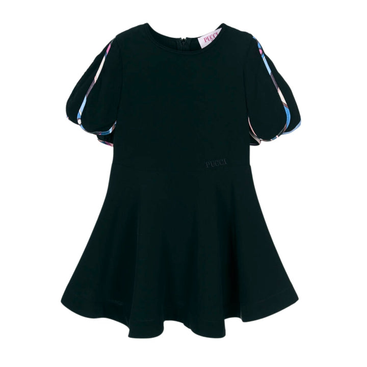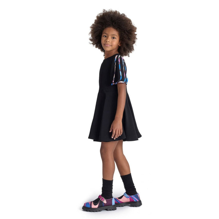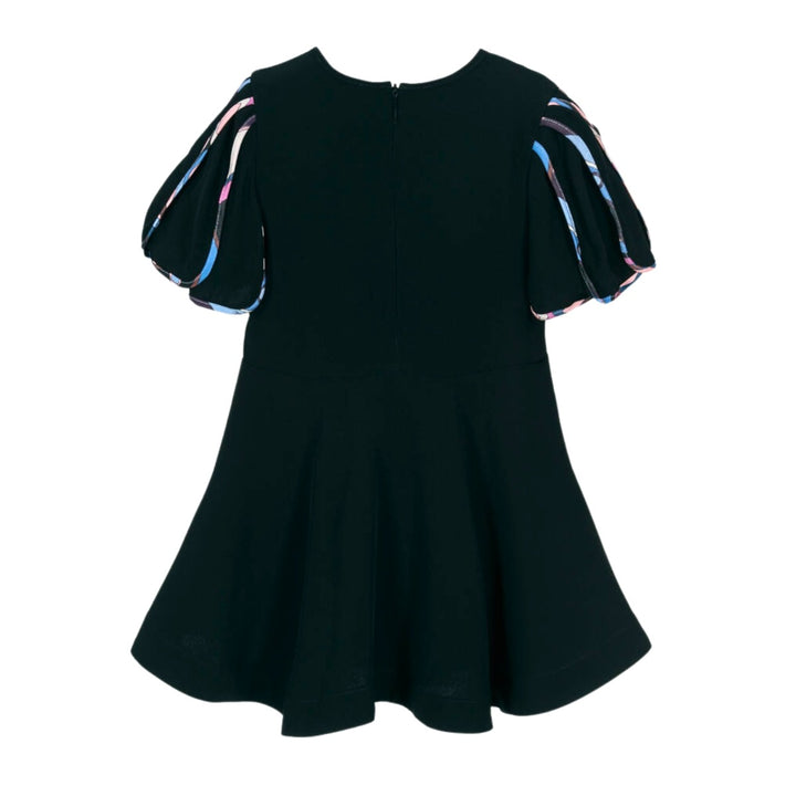 A black dress for girls by luxury label PUCCI, accented with blue, pink and purple. The Italian designer has styled this elegant dress with a skater silhouette, beautiful petal-style sleeves trimmed with the opulent Vivara print, and tonal logo embroidery on the waist. Fastening with a hidden zip on the back, it is made in soft, sleek viscose-mix crêpe for a sophisticated drape.