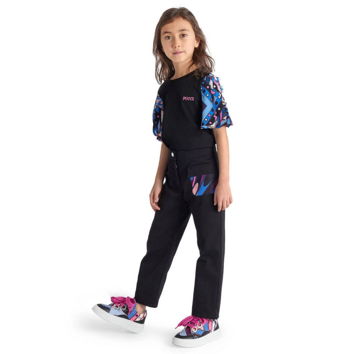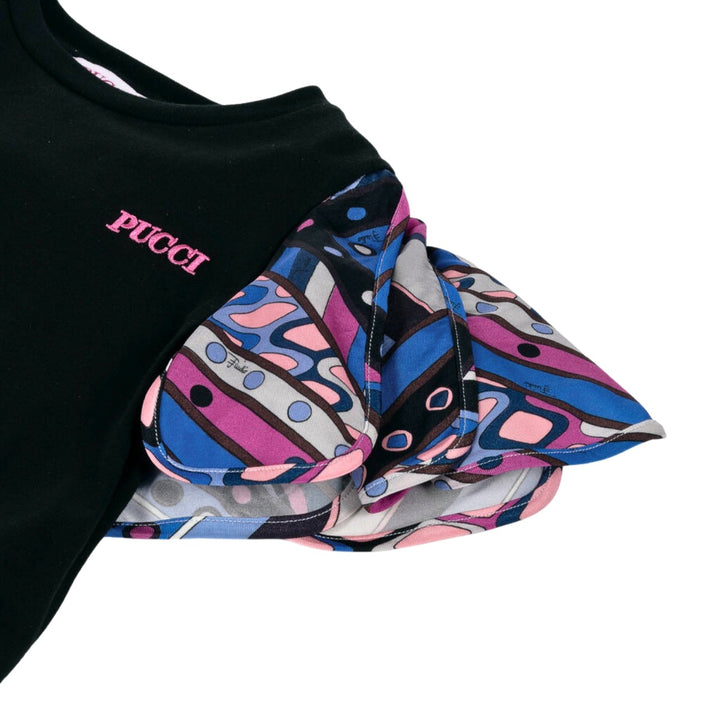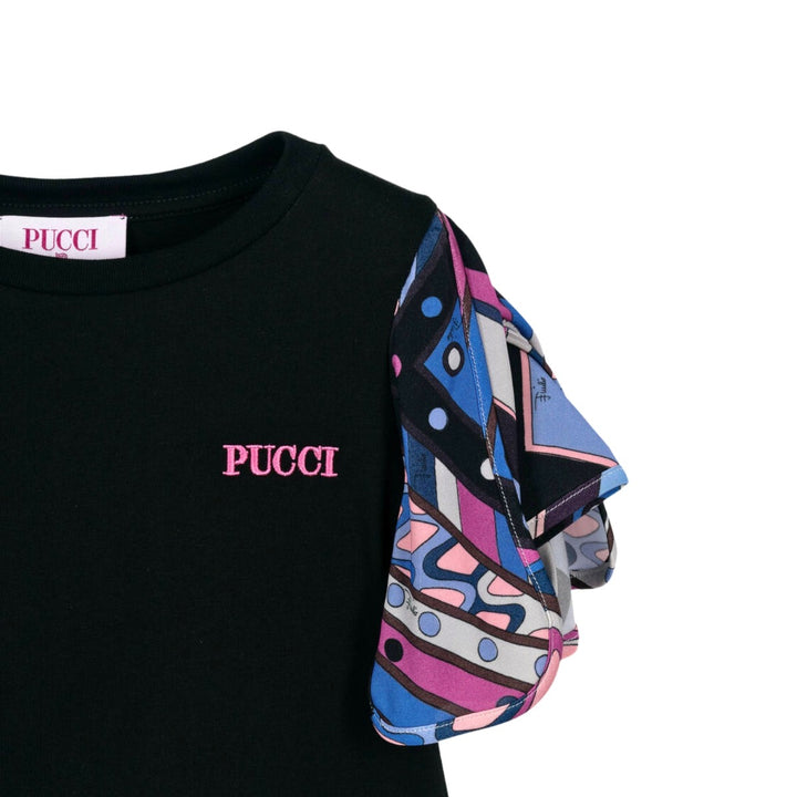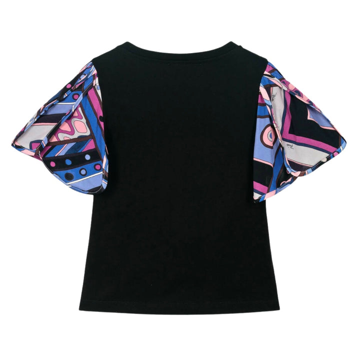 Black T-shirt for girls by Italian fashion house PUCCI, made in soft viscose jersey. The petal-like short sleeve are patterned in the brand's Vivara print in shades of pink and blue for a distinctive look. A pink embroidered logo on the chest adds a finishing designer touch.