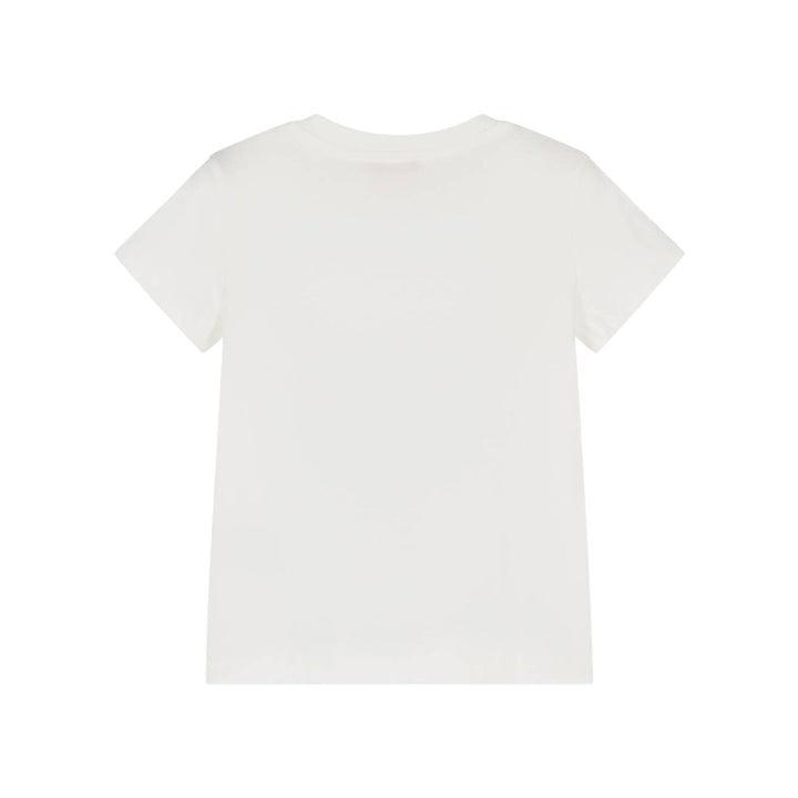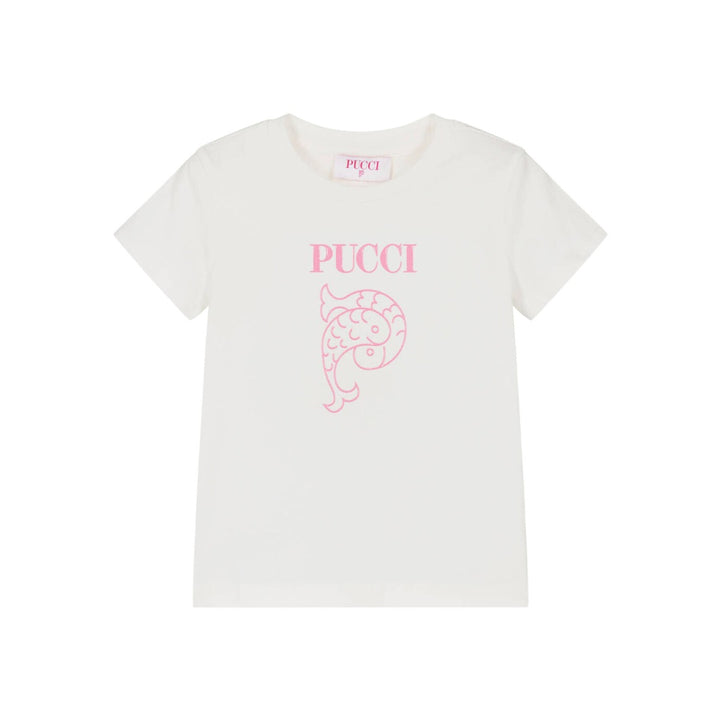 Ivory T-shirt for girls by luxury Italian fashion house PUCCI, made from soft organic cotton jersey. It has a rubberised signature fish logo on the front for a chic yet casual look.