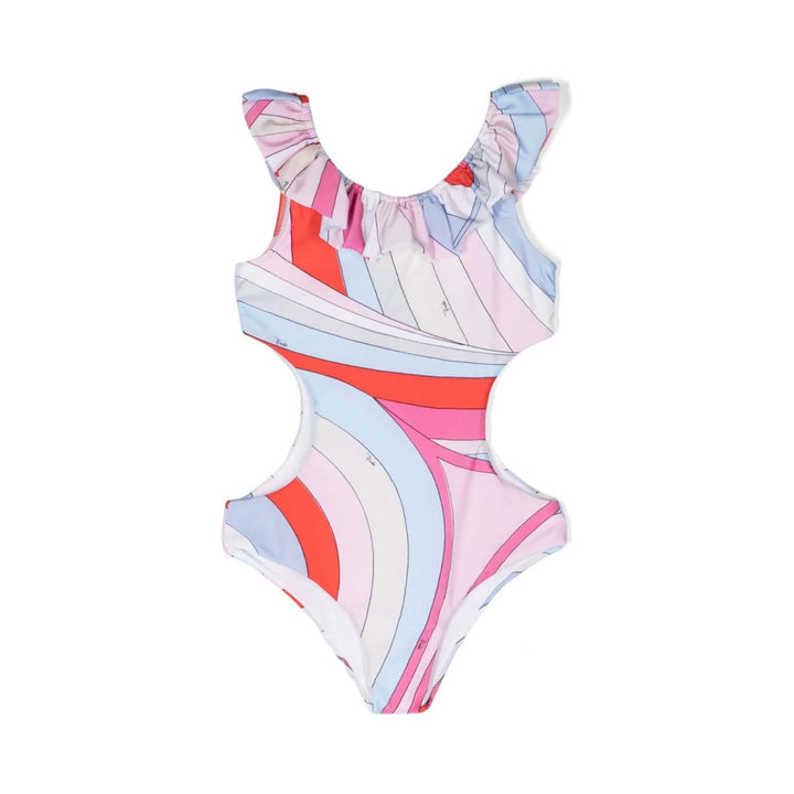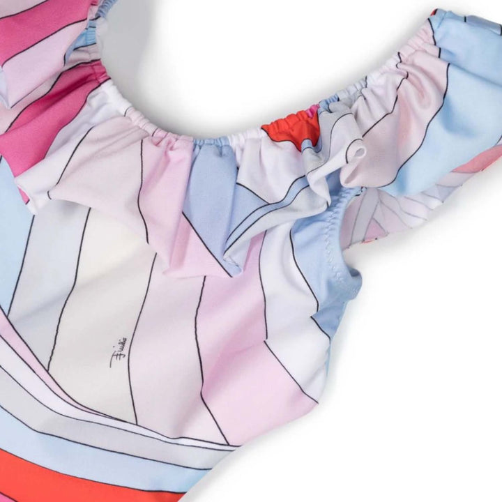 Gorgeous light pink swimsuit for girls by luxury Italian label PUCCI, patterned with the brand's beautiful Iride design and incorporating little black logos. It has an elasticated, frilled neckline, with stylish cut-out sections on the waistline. The swimsuit is fully lined for comfort and comes with a useful, branded storage bag.