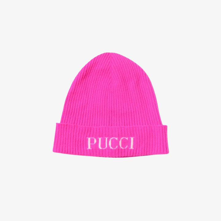 Emilio Pucci Junior girls pink hat. Ribbed knit, inlaid logo, crease brim and pull on design