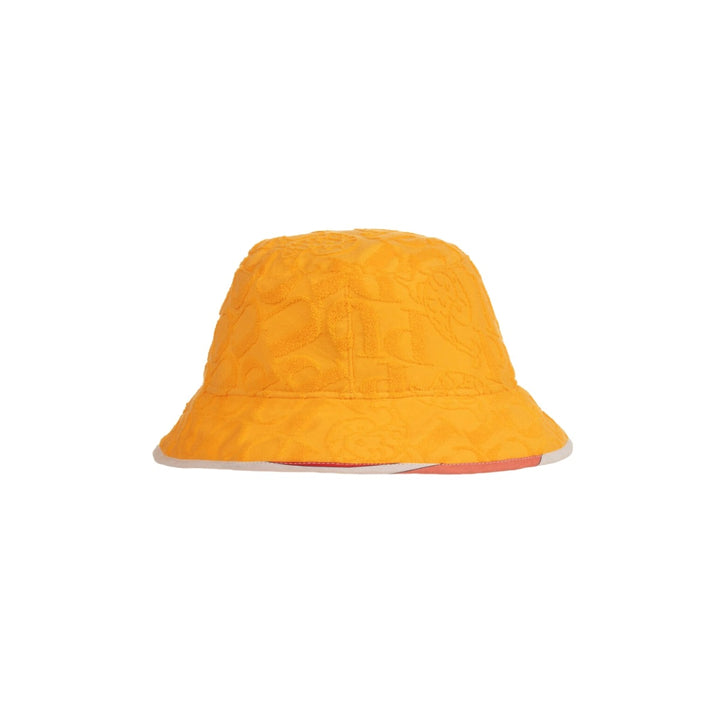 Deep yellow bucket hat for girls from luxury brand Emilio Pucci, made in cotton-blend jersey. With an all-over flocked jacquard logo with signature fish motifs and Marmo print trims it is undeniably Emilio Pucci. Lined with breathable cotton, it is comfortable on warmer days and the brim helps protect eyes from the sun.