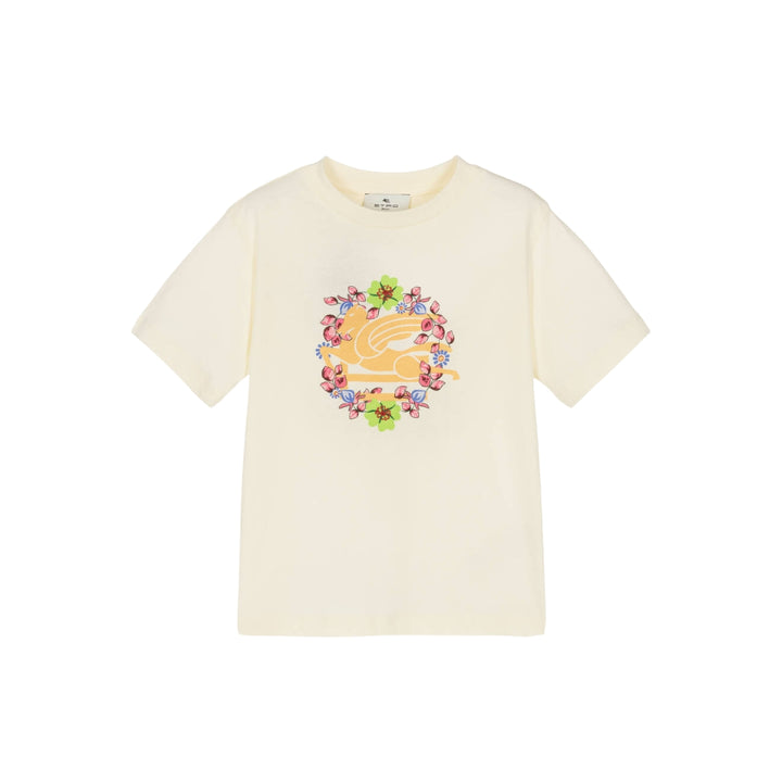A dark ivory T-shirt for girls by luxury brand Etro, made in soft cotton jersey. This casual piece has a lightly ribbed crew neck and short sleeves. An orange Pegaso logo is printed on the front, encircled by embroidered flowers in a pretty shade of pink.
