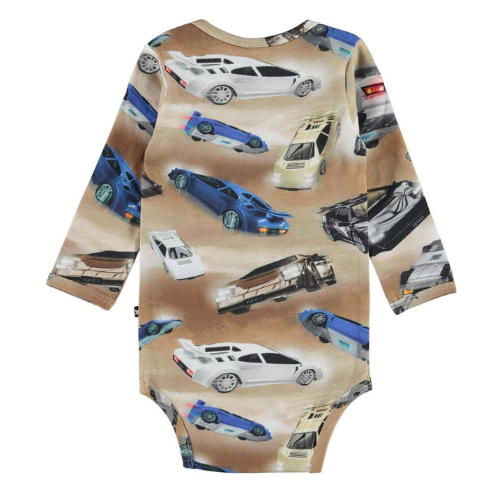 Faros is a light brown baby bodysuit with a car print. Wear it with matching trousers. Faros has an easy snap closure between the legs for quick changes. This Molo product is GOTS certified organic, which means that it is made with certified organic materials and produced under the strictest social and environmental standards throughout the entire manufacturing process. In addition, the GOTS certification secures that the product is free of hazardous chemicals. This Molo product is GOTS certified organic by Ecocert Greenlife, certification number 197496.