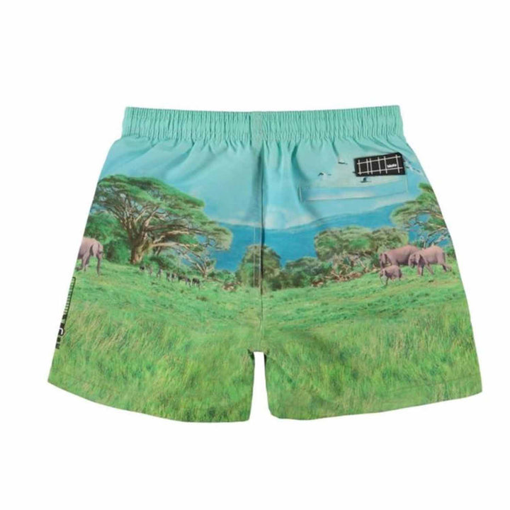 Niko is a pair of sporty swim shorts with a print of a beautiful landscape with a lion in the front. Niko has an elastic waist with ties to ensure a comfortable fit. Wear them with a matching t-shirt. Molo's swimwear has 5+ UV protection. This Molo p