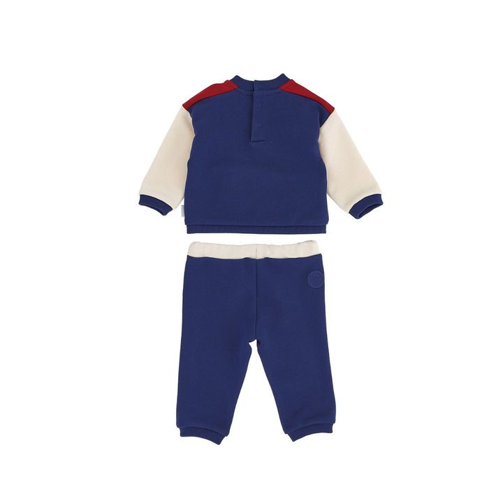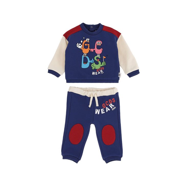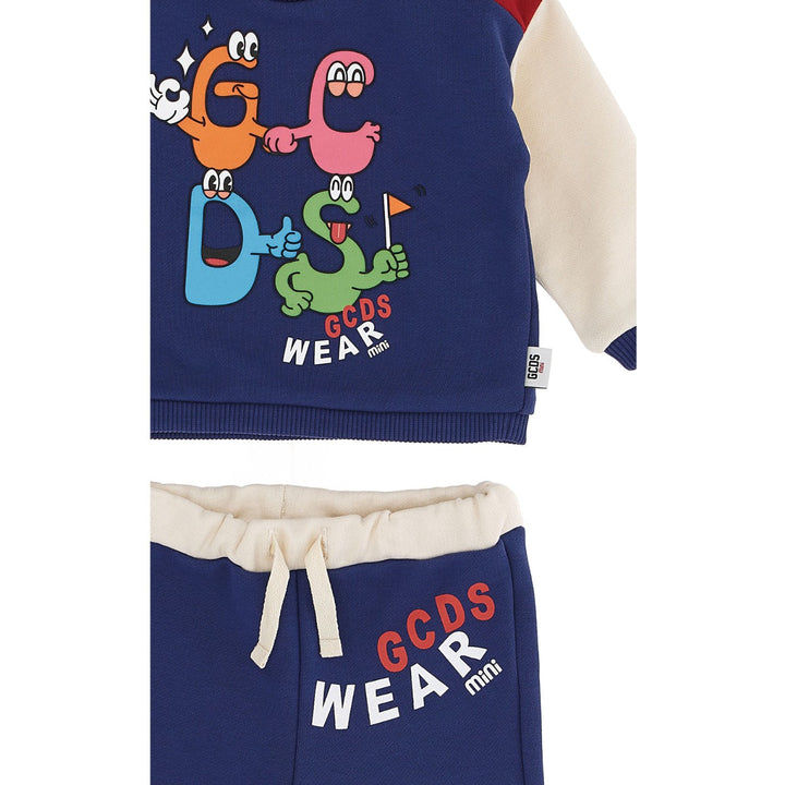 Blue color two piece hoodie set for boys by GCDS Mini made with organic cotton with alaphabet designs and colorful patches. It is finished with a arm band on the sleeve and end and on the pant ends.