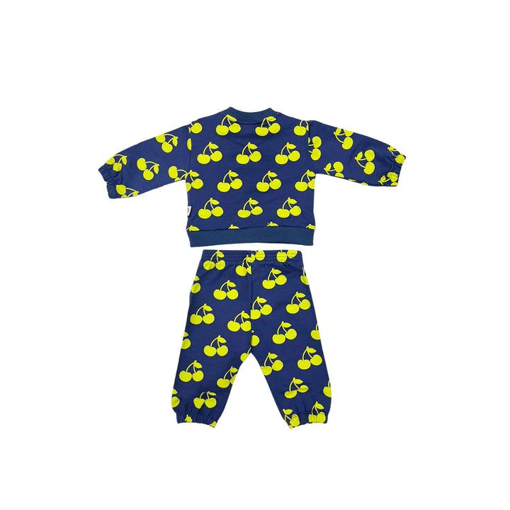Short Sleeve Stretch Cotton Jersey T-Shirt Featuring Cherry Pattern In Green And Blue Co-Ord Set. Gcds Logo Printed In White On The Front. The Cotton Sweatshirt Is Full Sleeved And With A Pair Of Pants.
