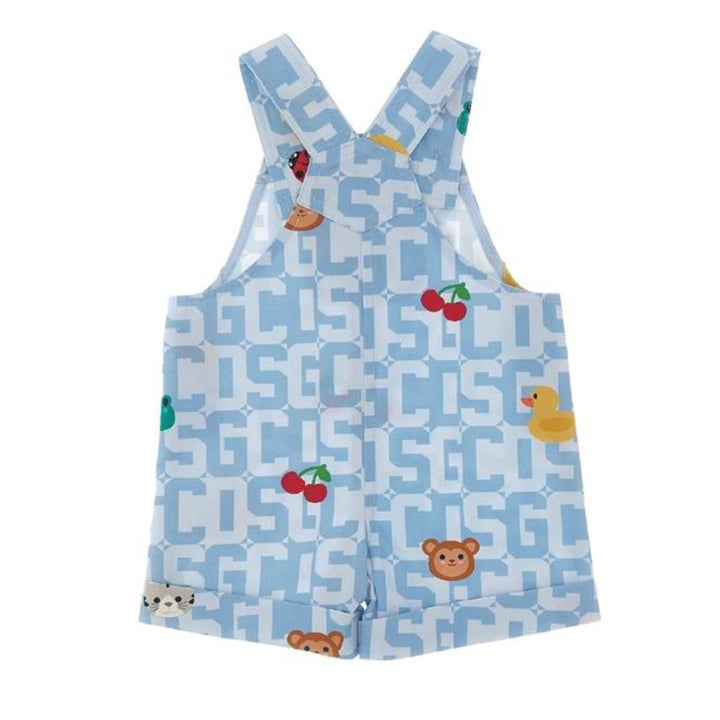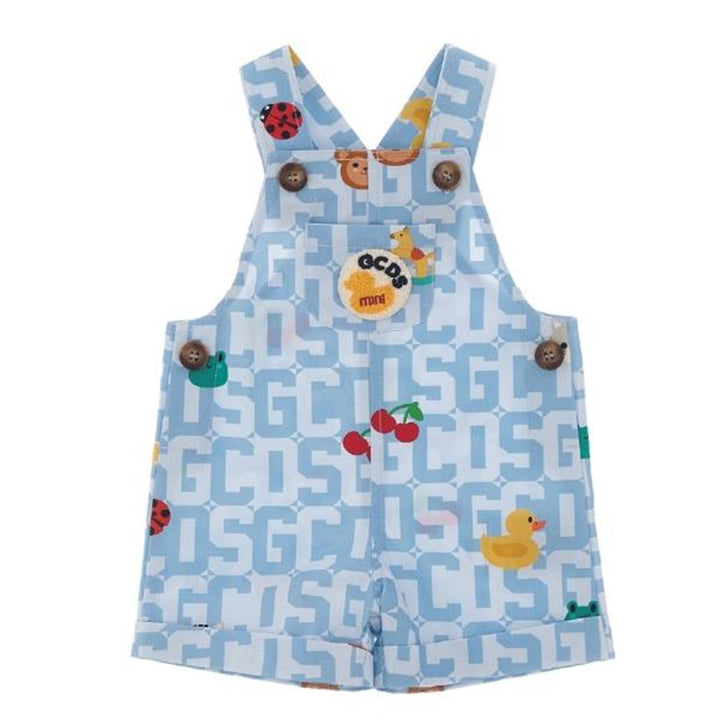 Monogram-Pattern Denim Dungarees From Gcds Kids Featuring Cotton, Wool Blend, Monogram Pattern, Patch Detail, Square Neck, Sleeveless And Blue-Multicolour. It Can Be Paired With A Cotton Tshirt Inside