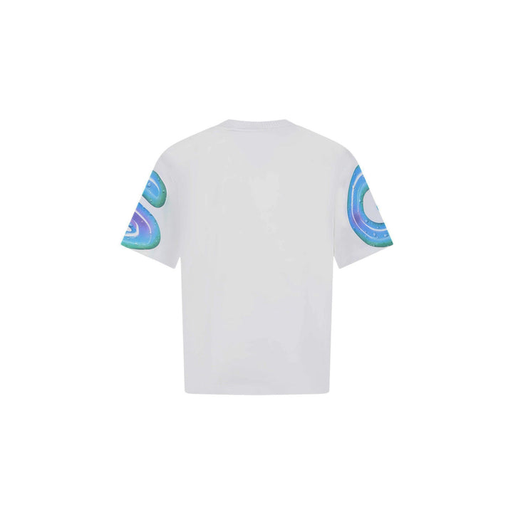 Short Sleeve Stretch Cotton Jersey T-Shirt In White. Logo And Graphic Printed In Blue And Green On The Front And On The Sleeves Of The T-Shirt. A Cool Summer Appareal For Kids From New Collection.