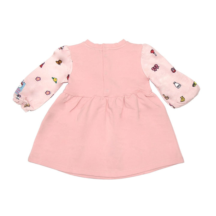Pink brushed cotton dress with long sleeves, ribbed crew neck and hem and clip closure on the back. It is embellished with embroidered fuchsia logo on the chest, Hello Kitty on the front and colorful designs on the sleeves.