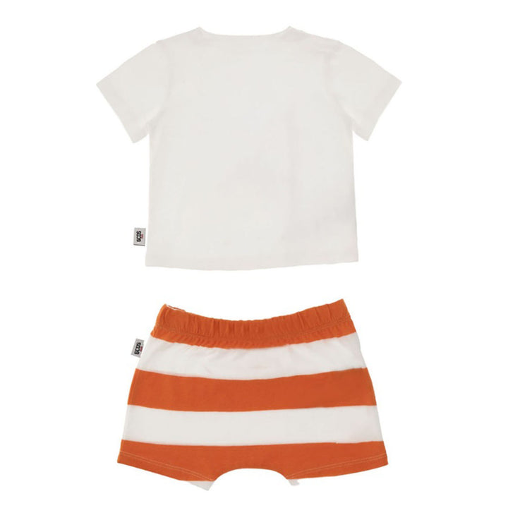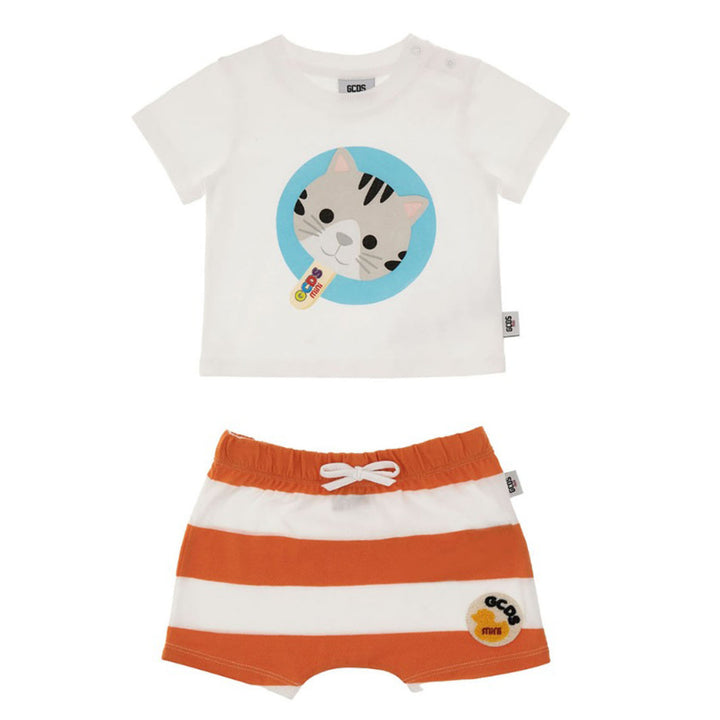 GCDS Kids two-piece co-ord set in pure cotton. It has a t-shirt with a cat print and orange striped shorts paired with it. The best summer apparel for kids. The t-shirt is a round neck with short sleeved and a waistband string.