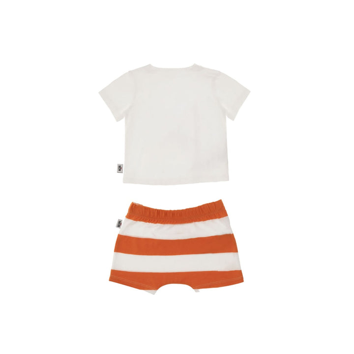 GCDS Kids two-piece co-ord set in pure cotton. It has a t-shirt with a cat print and orange striped shorts paired with it. The best summer apparel for kids. The t-shirt is a round neck with short sleeved and a waistband string.