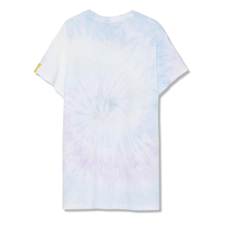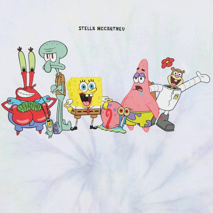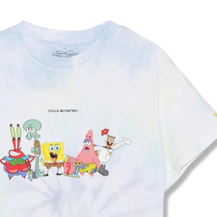 The product STELLA MCCARTNEY KIDS x SpongeBob SquarePants light blue tie-dye dress with light blue color, crew neck, short sleeves, fringed detail.