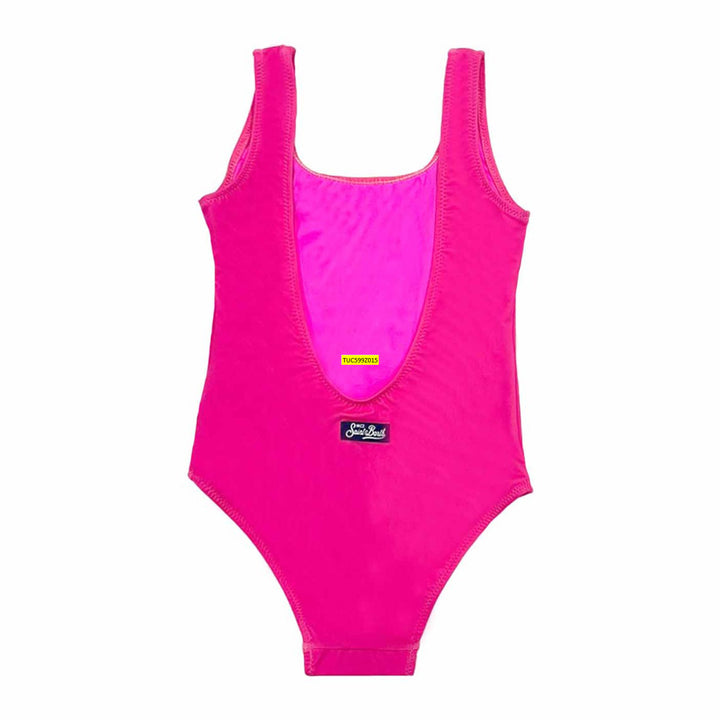 A pink swimsuit for teen girls by MC2 Saint Barth. Comfortable in silky, stretchy fabric, this cool swimwear piece is designed with Kitty iconic character. On the back is a logo label with a feminine scooped back detail. It has a full lining and the