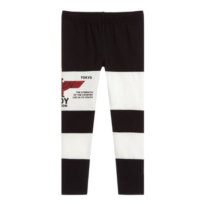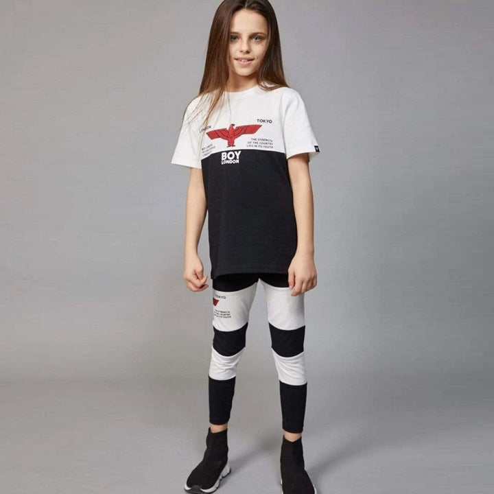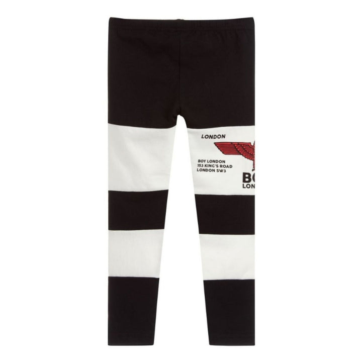 Girl Black cotton jersey leggings by BOY London, with white panels on the legs. These soft and stretchy leggings have a lightly elasticated waistband and a red wings logo on one leg.